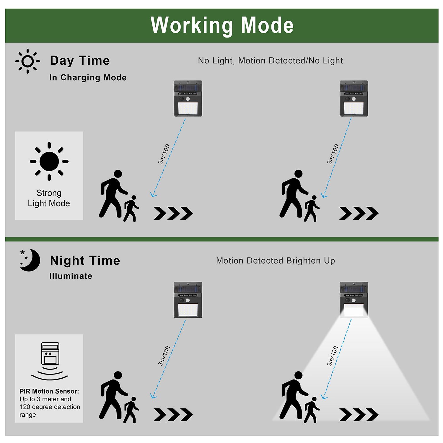 *Upgraded Solar Light*:Adopts advanced PIR motion sensor and no dim mode design,during the day the solar light will automatically switch off to save energy,and it will turn on when motions is detected within 3m in darkness or at night for safety protection.
