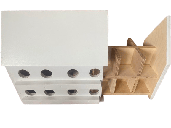 Includes a stand in front of holes for birds to stand on.