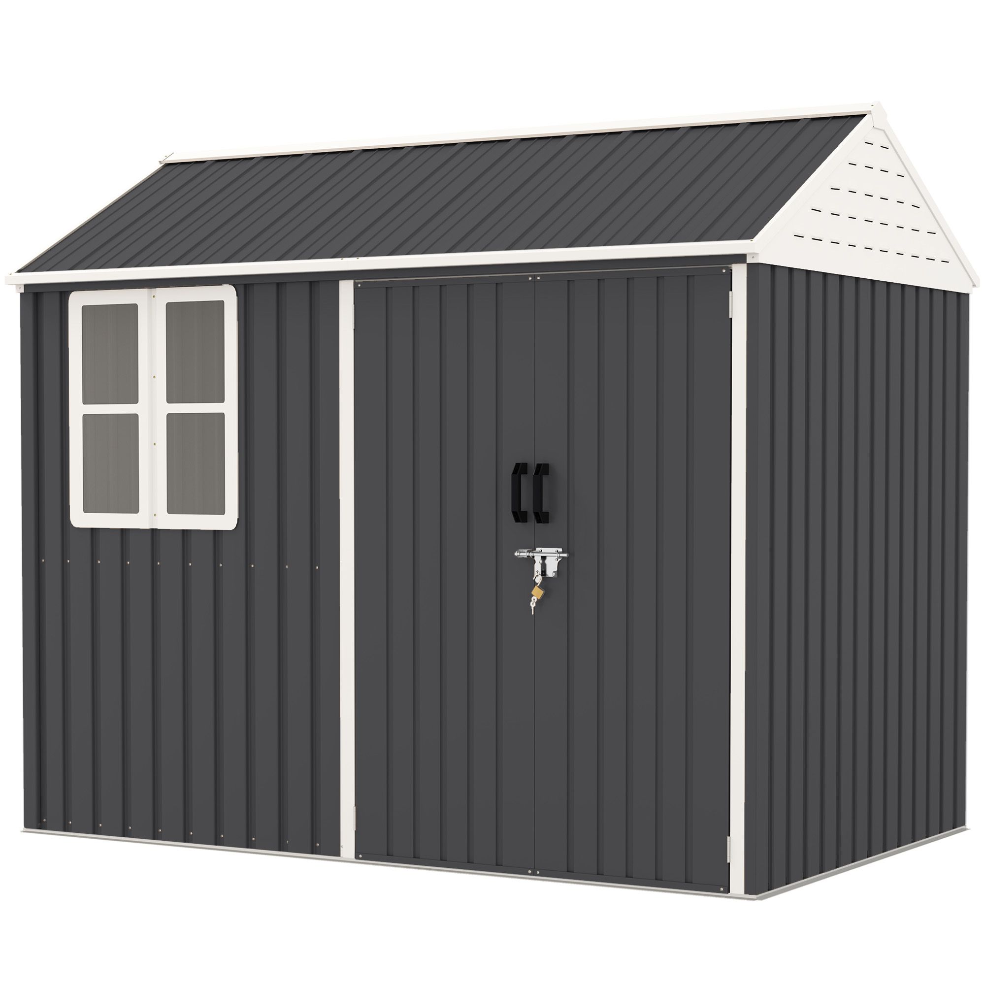 The metal storage shed from Outsunny is an excellent addition to your outdoor space, providing efficient tool organization. With 44 ft² of interior space, it can also serve as a storage house for bikes or motorcycles. The storage shed features double doors for easy access, a window for natural light, two side air vents to promote airflow, and a sloped roof preventing water buildup. For added security, it is equipped with a latch lock. Please note that the foundation is not included.