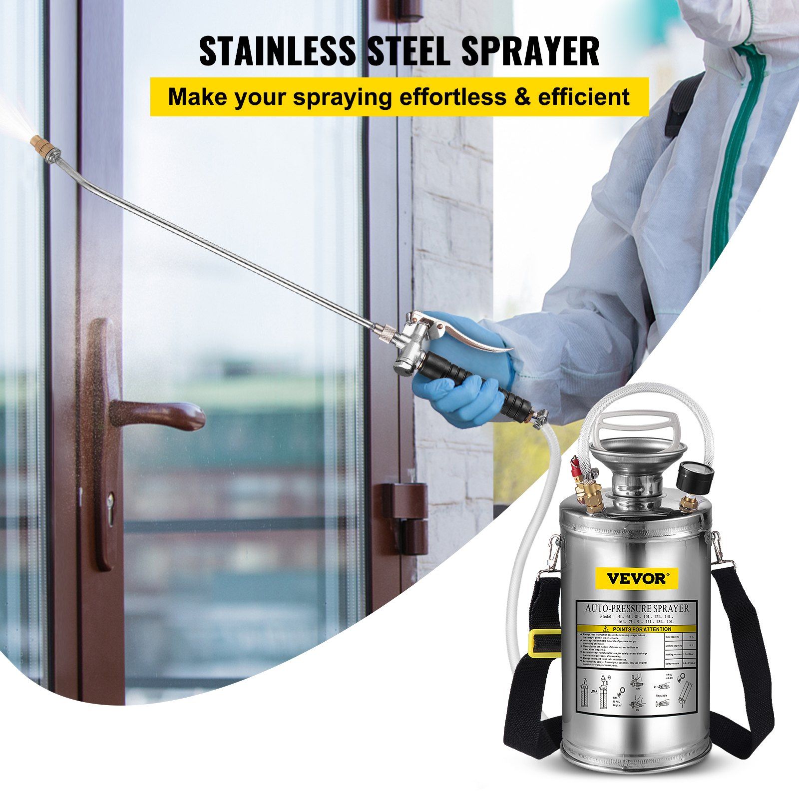 1.Durable Stainless Steel: Capacity: 1.5 Gal; Pressure: 1.5-4.0 Bar. This hand pump sprayer is made of stainless steel, rust-proof and durable. Pay attention that the rubber ring and internal design are not suitable for strong corrosive, acidic, and base solutions.